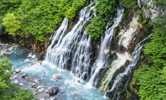 自然岩の間から染み出た地下水が勢いよく渓流に 流れ落ち、コバルトブルーにきらめく美瑛川がしぶきを上げている様子を、間近にみられるびえい白金温泉街の観光名所の1つです。